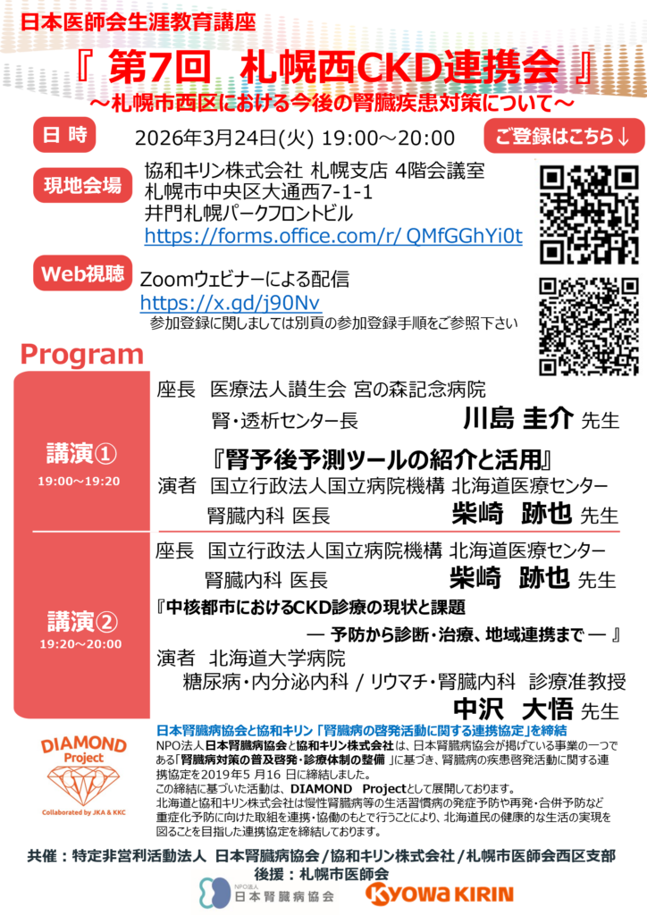 メインの講演は、北海道大学病院 腎臓内科 診療准教授の中沢大悟先生が「中核都市におけるCKD診療の現状度課題」です。